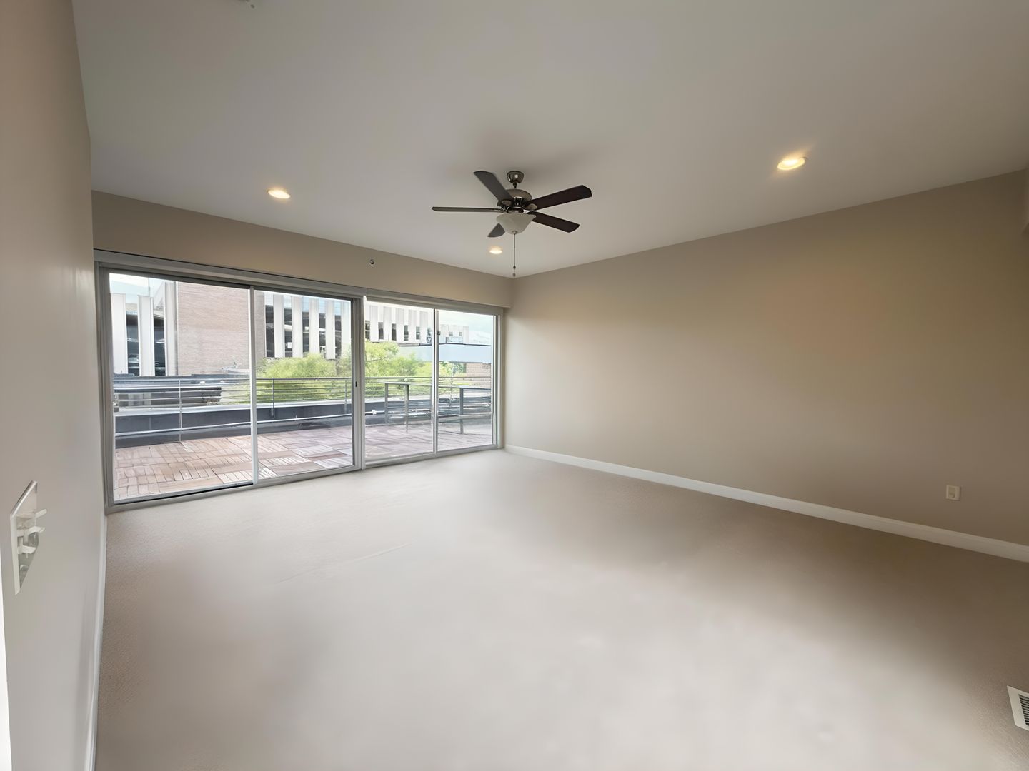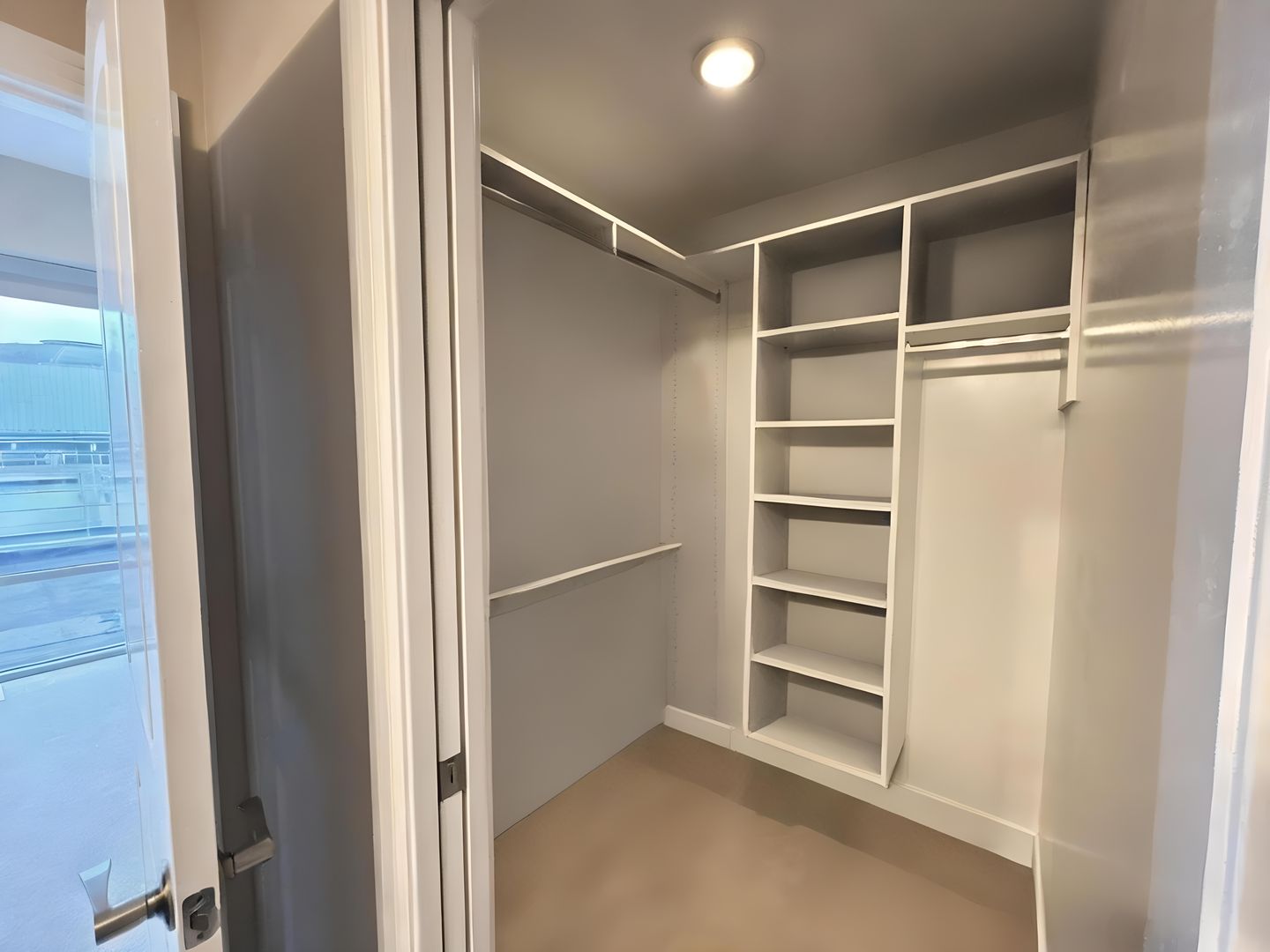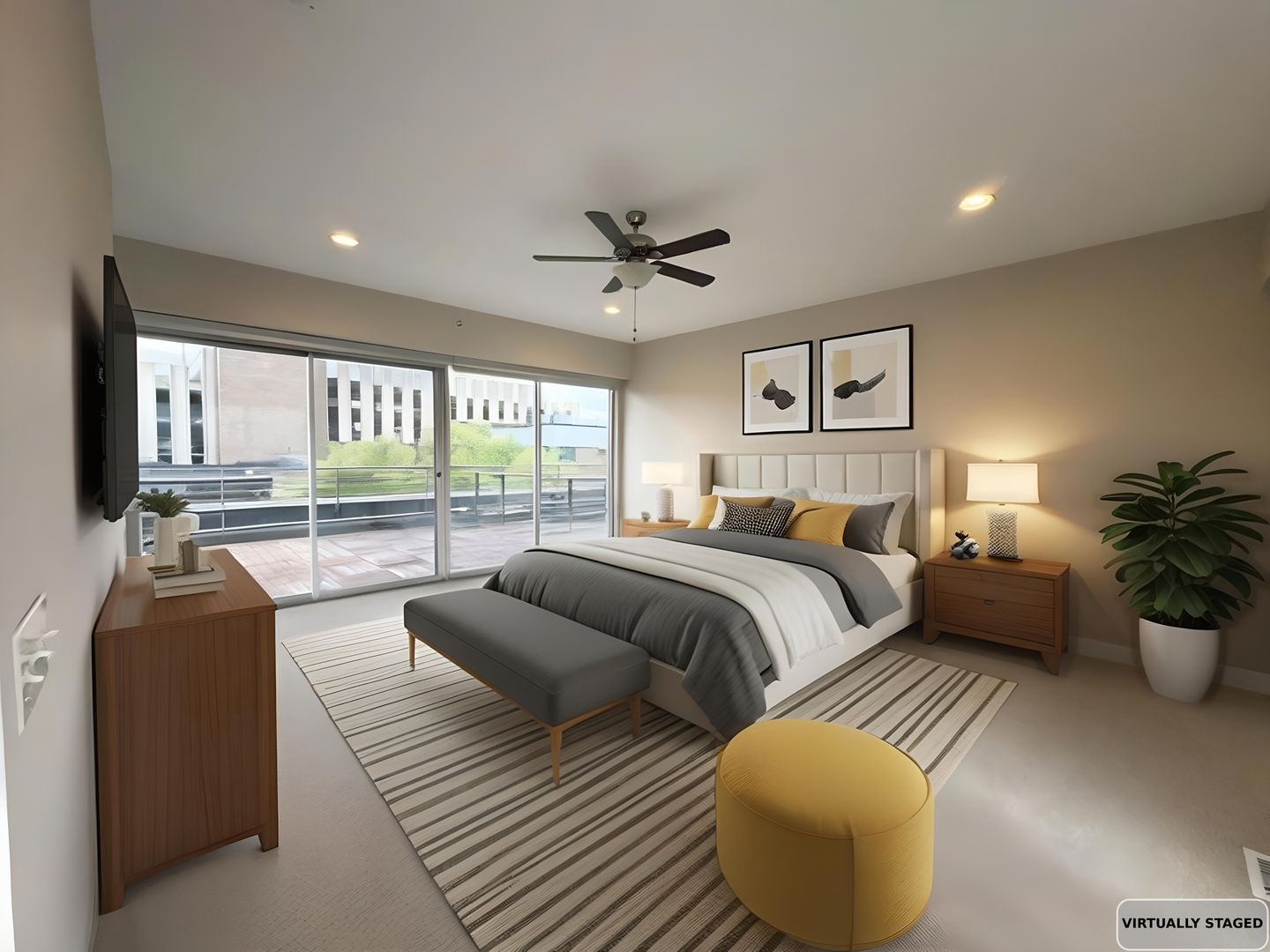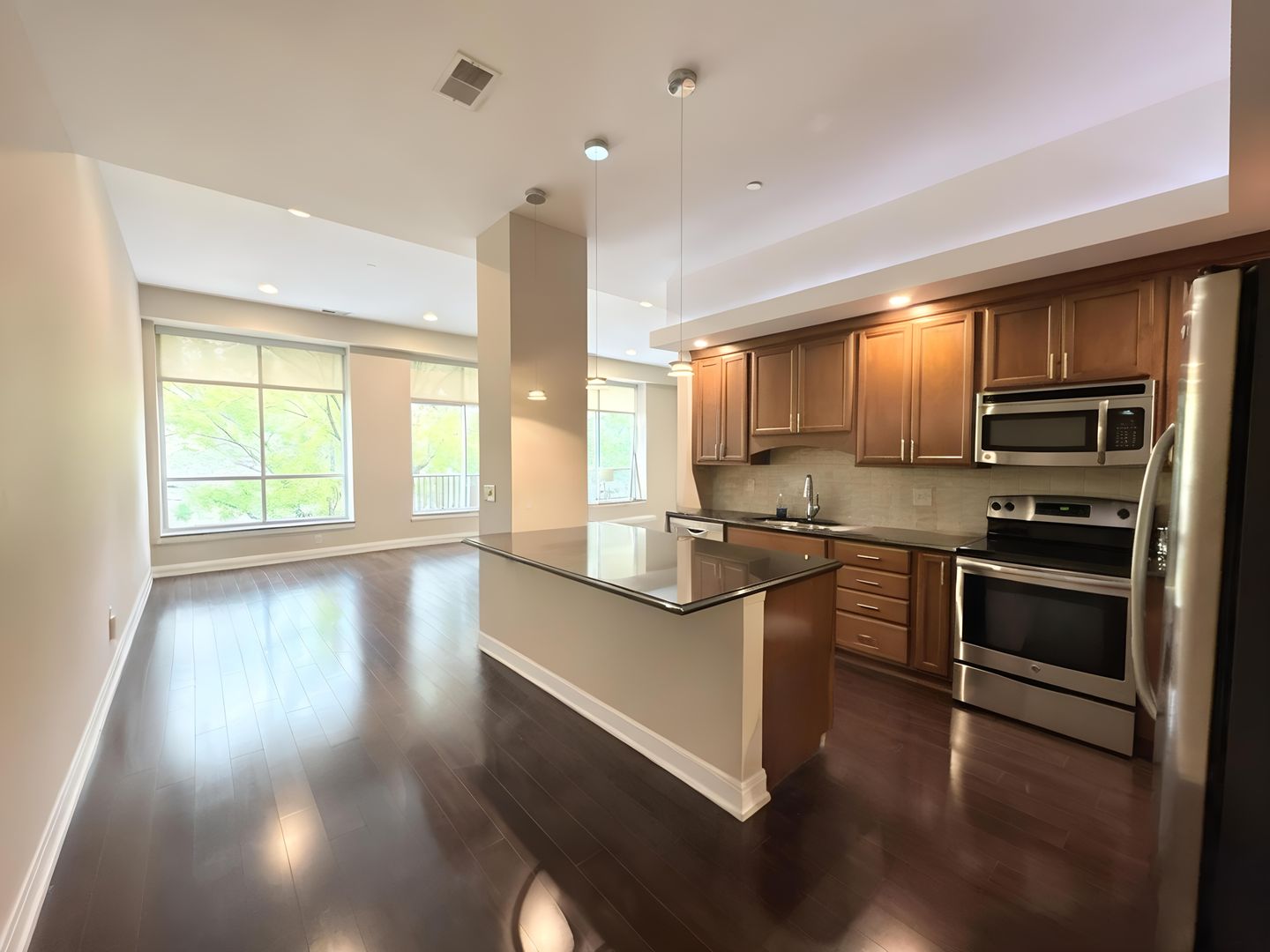 The apartment features wood flooring, ceiling fans, and floor-to-ceiling windows that provide a stunning view of the Kalamazoo Mall. The customizable walk-in closets and den/office area offer ample space for your needs. The kitchen is equipped with quiet close cabinets and stainless steel appliances providing a luxurious feel. The apartment is also equipped with a full size washer and dryer for your convenience.